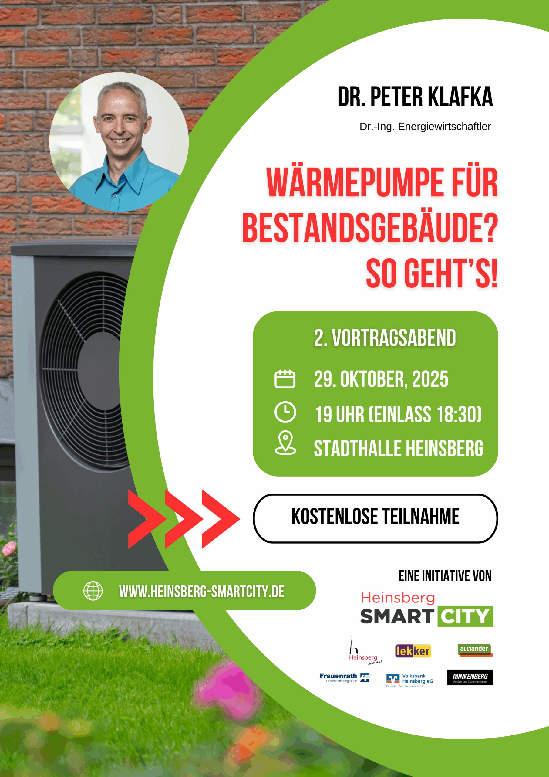 Darum lädt die Initiative Heinsberg Smart City den renommierten und ausgewiesenen Experten für Wärmepumpen, Dr. Peter Klafka, für einen Vortrag und eine anregende Diskussion in die Stadthalle nach Heinsberg ein.